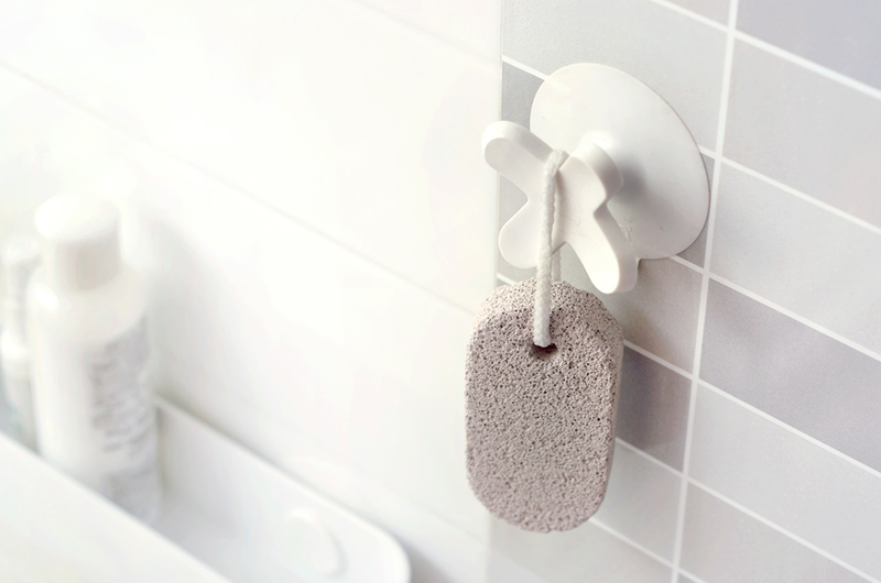 利用衛(wèi)生間的墻面,用吸盤掛鉤收納也可以。