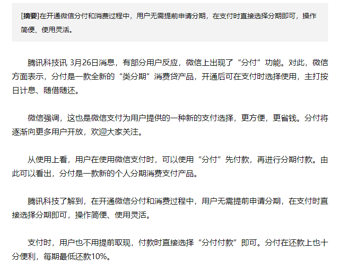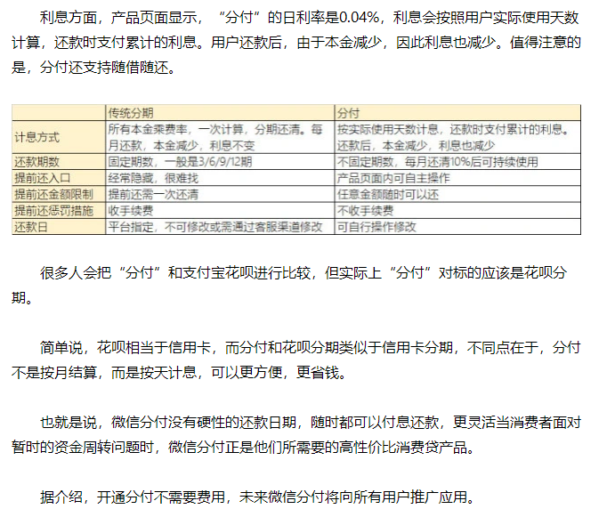 以下為騰訊科技訊,標(biāo)題“微信分期消費(fèi)貸產(chǎn)品“分付”上線:還款后本金減少 利息也減少”原文