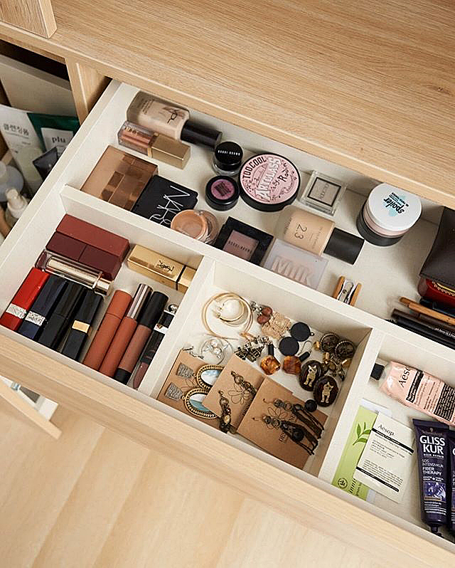 臺面上是開放式收納架,鏡子后也隱藏儲物空間。臺面下方是推拉式的抽屜,提供了充分的收納空間,從化妝品到生活必需品都可以在化妝臺里整理。