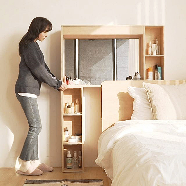 從側(cè)面拉出柜子,變身梳妝臺,床頭板背面是隱藏式置物架。
