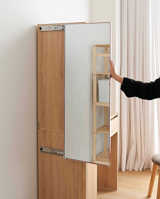 使用完后將全身鏡推回原位完全不占空間,桌子底下的擱板還可以收納不常用的物品,這個設(shè)計就算空間局促的小臥室也能hold得住。