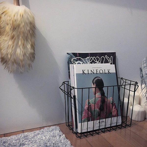 細(xì)長(zhǎng)的黑色鐵絲網(wǎng)籃子,適合收納雜志等大型書籍。