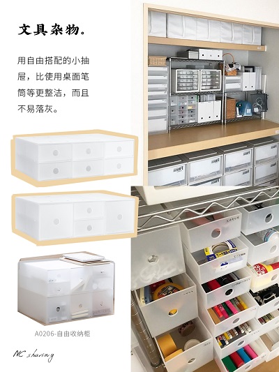 1. 文具雜物:用自由搭配的小抽屜,比使用桌面筆筒等更整潔,而且不易落灰。