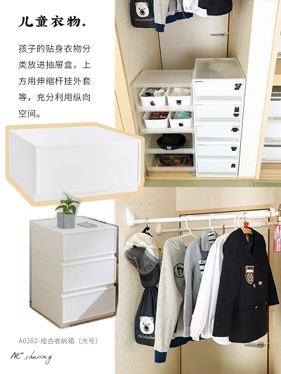 2.兒童衣物:孩子的貼身衣物分類放進(jìn)抽屜盒,上方用伸縮桿掛外套等,充分利用縱向空間。