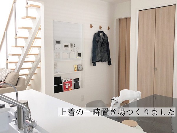 回家時的外套和看了一半的書等,經常帶進客廳的東西,要做好“臨時住所”以防止亂七八糟。 利用墻壁收納的話,地面上不會雜亂,也很容易打掃。