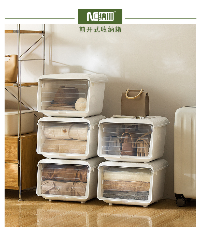 放置在高處的收納箱,每次要拿物品都格外的小心,要不然就會(huì)被砸到誤傷。這款前開式收納箱,就算幾個(gè)疊加起來,也能輕松拿到放置在最下面收納箱的物品。固定前置式翻蓋,解放雙手,隨心拿取放置物品,透明的可視窗,一眼就能找到所需物品,免去了翻找的麻煩,箱頂凹槽的設(shè)計(jì),保證在疊加的時(shí)候穩(wěn)固不易傾倒,底部設(shè)計(jì)防滑腳墊,讓放置更加穩(wěn)固,而且還不傷地面或者柜子。