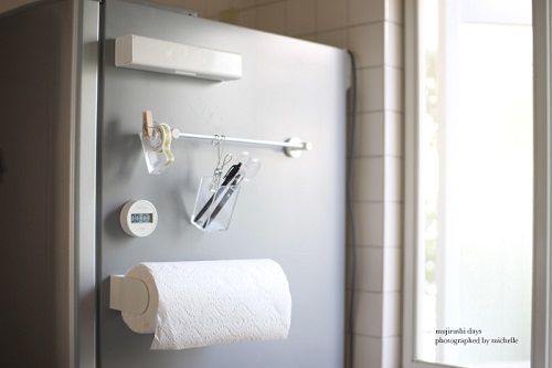 冰箱的門和側(cè)壁也試著活用收納吧。將經(jīng)常使用的廚房紙和保鮮膜用磁貼粘在冰箱上,使用掛桿和掛鉤收納標(biāo)記食譜用的筆等小物件!統(tǒng)一顏色也給人干凈整潔的舒適感。