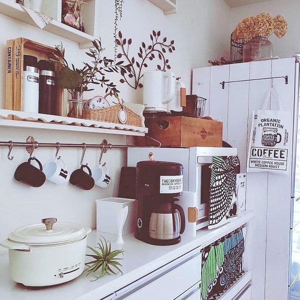 使用毛巾掛桿等像酒吧一樣把馬克杯懸掛收納。沒(méi)有把手的玻璃杯、水壺等放在層架上,有把手的杯子懸掛起來(lái),整個(gè)空間變得更靈動(dòng)。特別可以將喜歡的馬克杯展示出來(lái),感覺(jué)真的很棒。