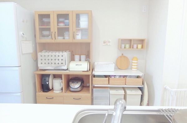 馬克杯和玻璃杯等收納在離冰箱最近的抽屜里。因?yàn)楸淅镆话銜?huì)有飲料,冰箱附近有杯類的話動(dòng)線會(huì)變短。另外,像這個(gè)抽屜上放著電水壺,馬上就能取出杯子裝水是很好的體驗(yàn)。