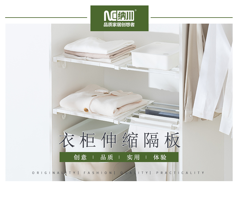 衣柜的整體空間一般比較大,中間的隔斷要么是固定的,要么是沒有的,想要做到隨心所欲就得借助衣柜伸縮隔板。四個(gè)規(guī)格可根據(jù)自家衣柜的大小自行選擇,分層讓衣柜的空間翻倍,可以規(guī)整有序的放置更多物品,設(shè)計(jì)可自由伸縮模式,根據(jù)所需空間規(guī)格自由調(diào)整距離,更加隨心,伸縮架搭配隔板既可吊掛衣物,又可平穩(wěn)放置,還可添加掛鉤懸掛除濕劑或者香包之類的物品,無需打孔不用釘安裝不留痕跡,可以反復(fù)使用,加大軟膠墊增加摩擦力使放置衣物時(shí)更加穩(wěn)固。