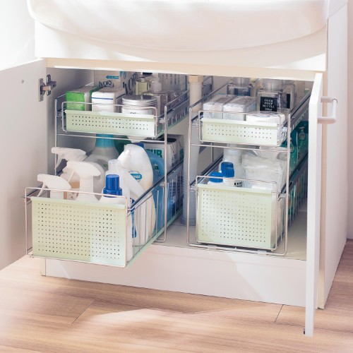 想要保持洗手臺(tái)周圍清潔,高效利用洗手臺(tái)下方空間是關(guān)鍵。根據(jù)尺寸放入抽屜式置物架,空間可以毫無(wú)浪費(fèi)地好好收納。