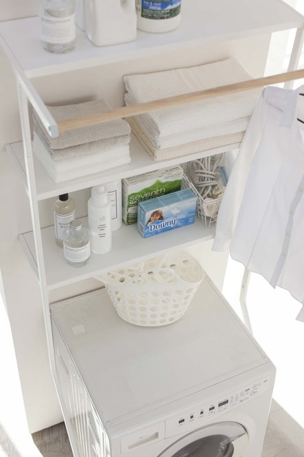 如果洗手間沒(méi)有足夠的存儲(chǔ)空間,可以放置一個(gè)層架,僅靠在墻上即可有效地利用洗衣機(jī)上方的空間,輕松增加存儲(chǔ)量。