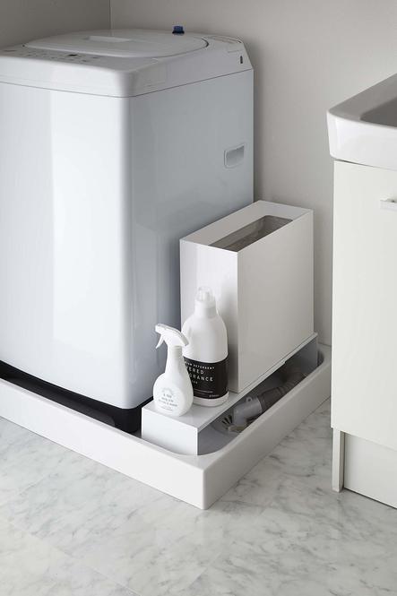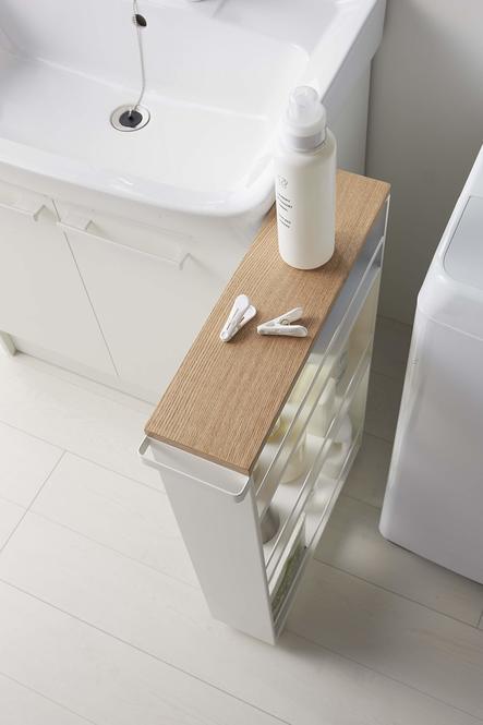 正好可以進(jìn)入洗衣機(jī)和洗手臺(tái)之間的間隙的窄型推車。底部帶有萬(wàn)向輪,方便推入和拉出。從蠟、噴霧等小物品到笨重的大罐洗滌劑等都可以很整齊地收納。