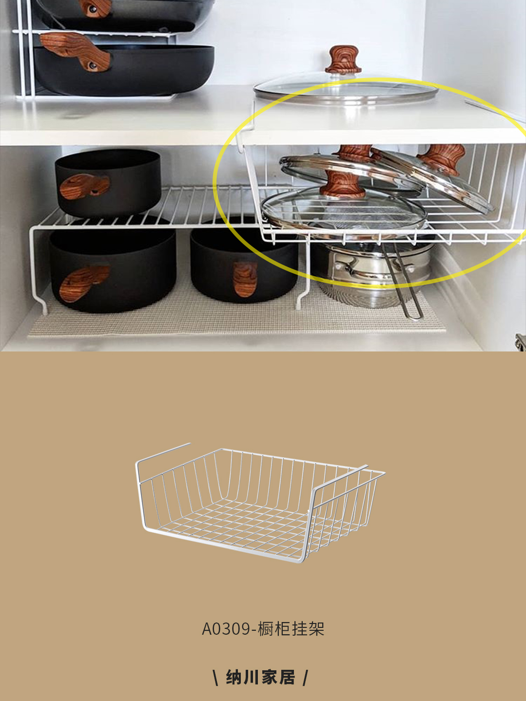 在櫥柜內(nèi)的隔板增加一個(gè)掛籃,巧妙劃分空間,可以大大提升收納量。吊掛設(shè)計(jì)簡(jiǎn)單實(shí)用,還可以掛在吊柜底板或桌面下面擴(kuò)展儲(chǔ)物空間。
