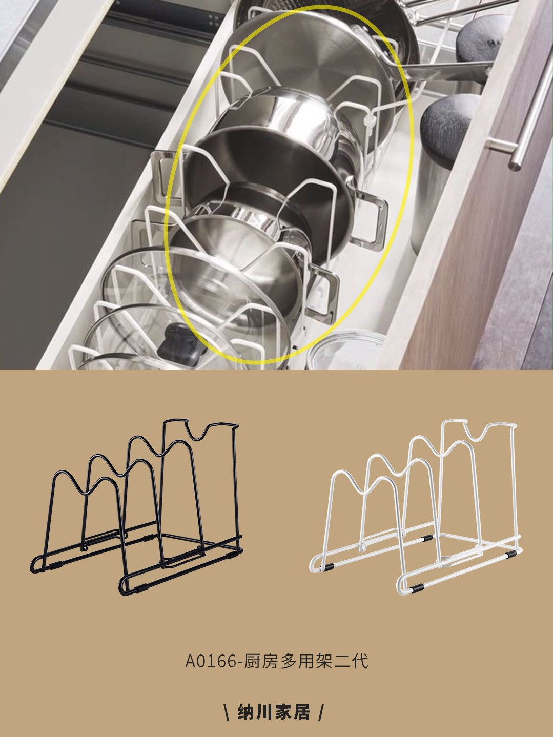 在櫥柜內(nèi)放入高度合適的層架,平底鍋、鍋蓋可以一層一層放進(jìn)去,充分利用空間,而且解決是堆疊難取放的麻煩。