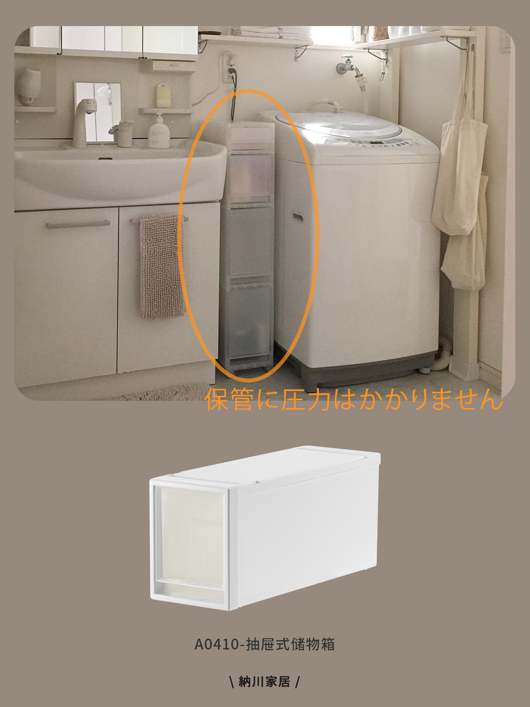 洗衣區(qū)離不開各種清潔劑瓶瓶罐罐,使用窄型抽屜箱,根據(jù)需求疊放作為夾縫柜使用。抽屜設(shè)計(jì),便于在小空間取放物品。