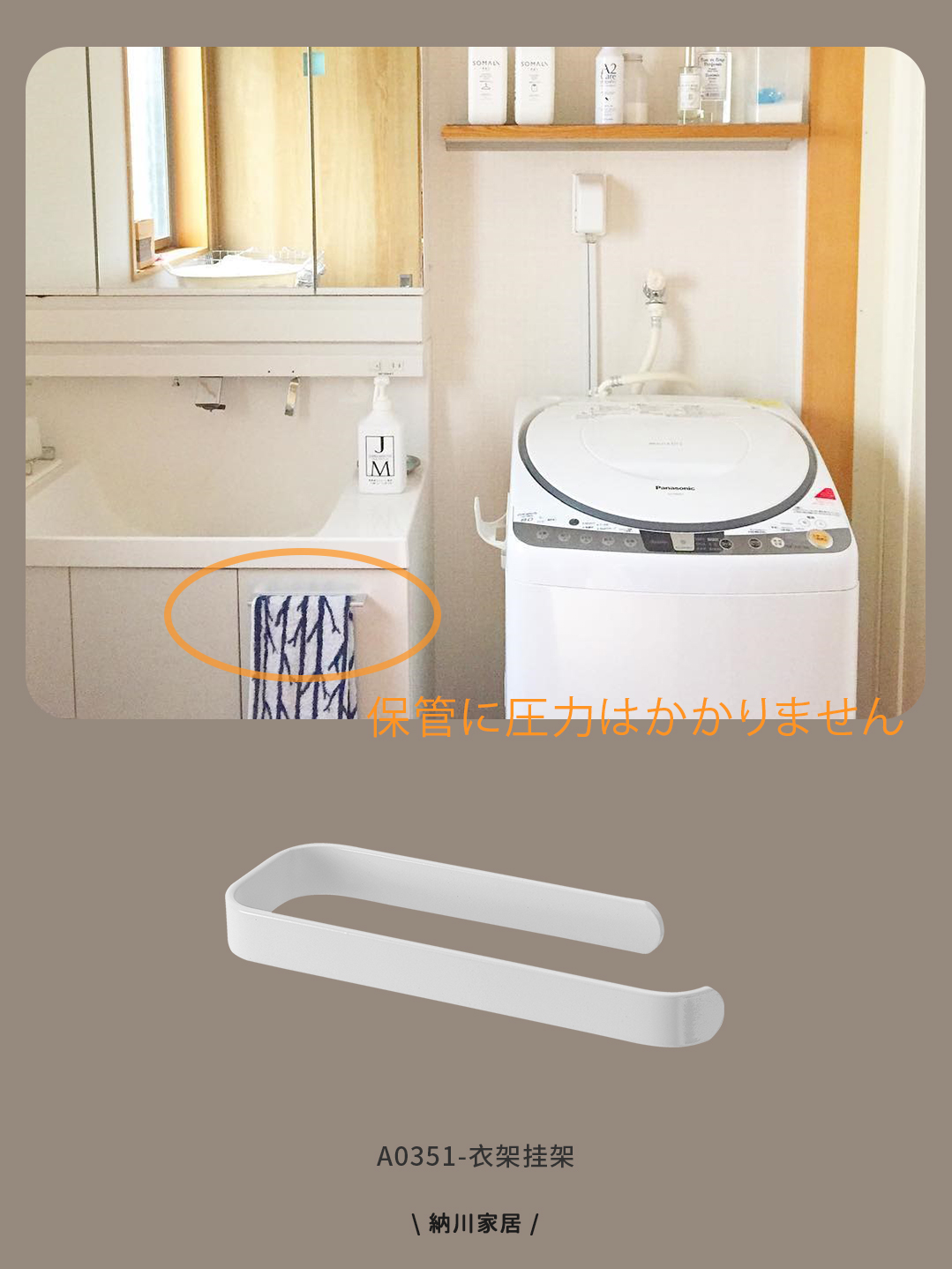 衣架收納是洗衣區(qū)收納的一大難題,免釘設(shè)計(jì)的衣架掛架可以隨意安裝的洗手臺側(cè)面或瓷磚墻等,收納常用衣架,節(jié)省空間,整齊易拿取,也可以掛置毛巾等小物件。