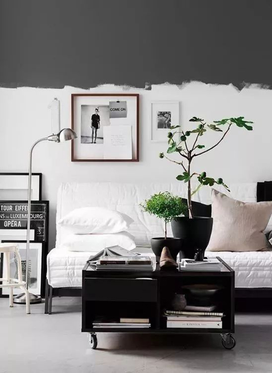 刷一半顏色留一半的白墻,可以免了糾結(jié)沙發(fā)背景墻和電視背景墻怎么裝飾的煩惱。而且這種雙拼色墻面,還可以搭配裝飾來錦上添花,讓空間更有生趣。