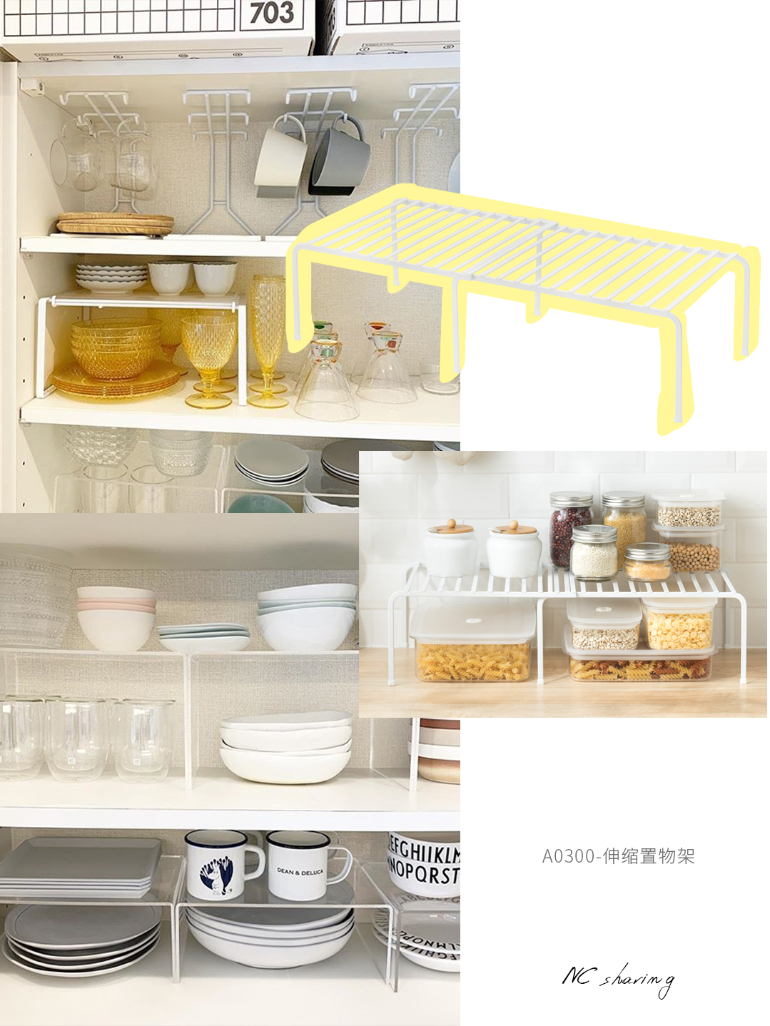 用伸縮置物架增加櫥柜分層,放置位置更靈活??梢远喾藕芏嗤氲》乓岔樖值枚?。