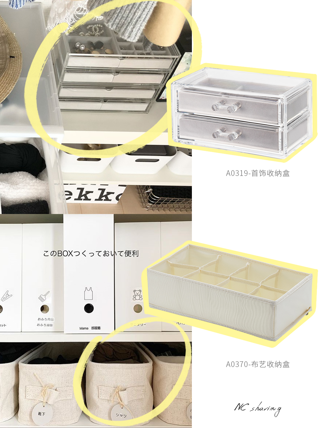 用可疊放的不同規(guī)格的收納盒,分類規(guī)整物品,注意選擇抽屜式的,方便取物。