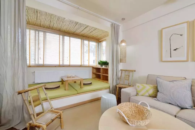 最簡單的一個(gè)方式就是將飄窗的空間騰出來,一個(gè)席子、一個(gè)茶盤、兩個(gè)蒲團(tuán),簡單的配置就達(dá)到了簡易榻榻米的要求。