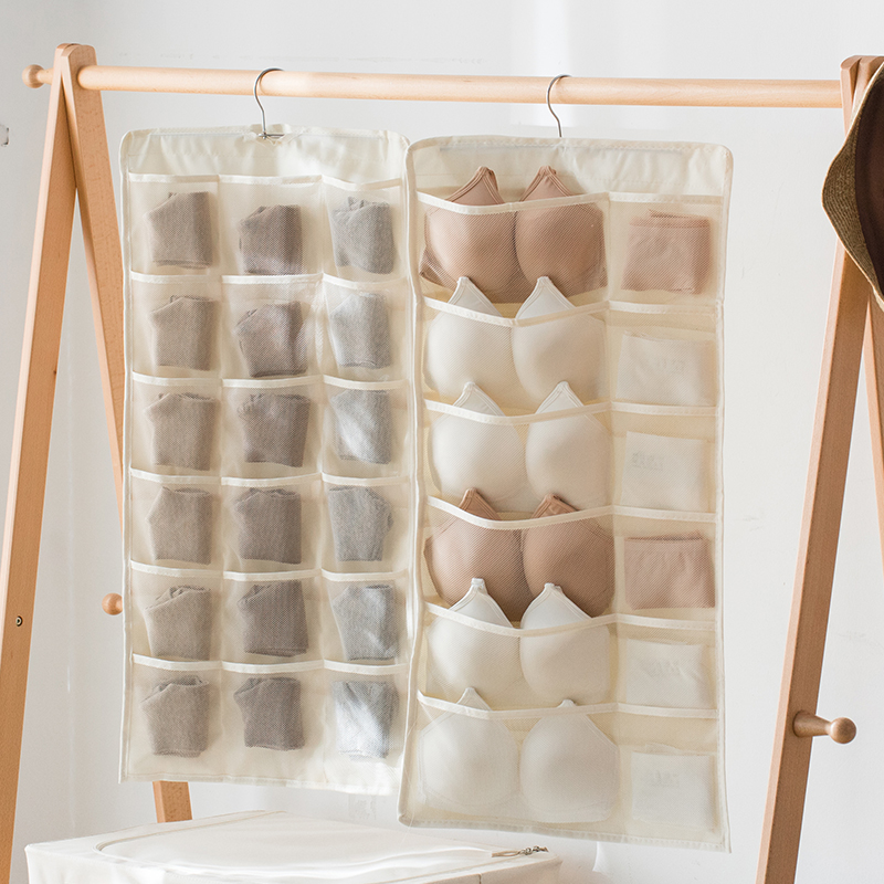 內(nèi)衣、內(nèi)褲、襪子等小件衣物,占據(jù)衣柜空間,而且零散難整理。納川雙面收納掛袋,雙面設(shè)計,容量翻倍,充分利用垂直空間。多口袋設(shè)計,一面18個小格,一面6小格加6大格,貼心細(xì)分收納。網(wǎng)格口袋,透氣性好,透明可視,方便查找物品。360°旋轉(zhuǎn)掛鉤,方便拿取物品。細(xì)密牛津布,承重耐用,閑置時可折疊收納,不占空間。