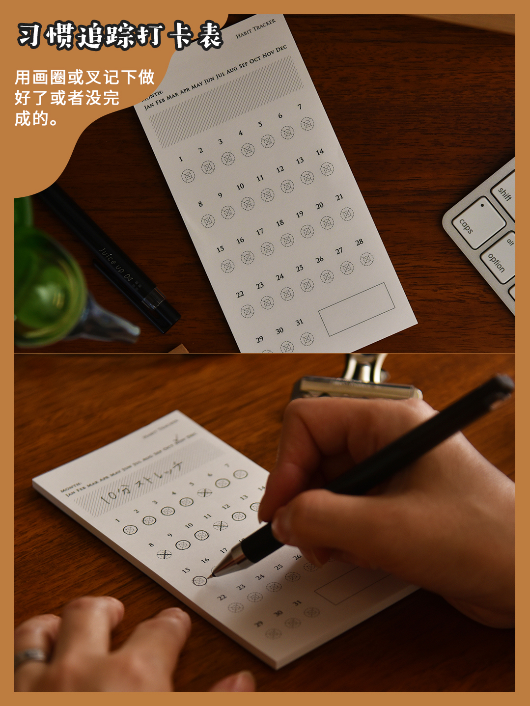 習(xí)慣追蹤打卡表,寫下目標(biāo)、想成為習(xí)慣的東西,用畫圈或叉記下做好了或者沒(méi)完成的,雖然很簡(jiǎn)單,但是是很有成就感的記事本。