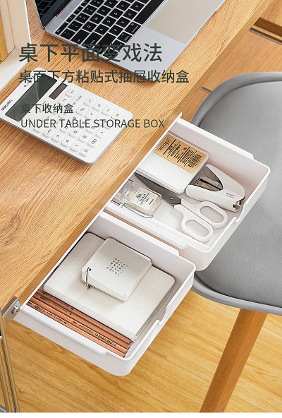 大多數(shù)為了美觀,桌子底下都設(shè)計(jì)成沒有抽屜的簡單容易搬動的桌子,大部分公司的辦公桌也是如此,抽屜式的桌下收納盒,釋放了臺面的空間。適用于多種場合使用,特別適合租房一族的愛美女生收納常用的化妝護(hù)膚品,甚至是首飾或者衣服配飾,安裝一個在衣柜的隔板下面可以收納細(xì)小衣服。配備無痕膠安裝也比較方便省事,而且特別牢固。內(nèi)部設(shè)有卡扣,防止快速抽拉時(shí),盒子脫落。