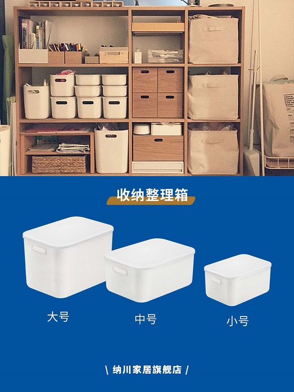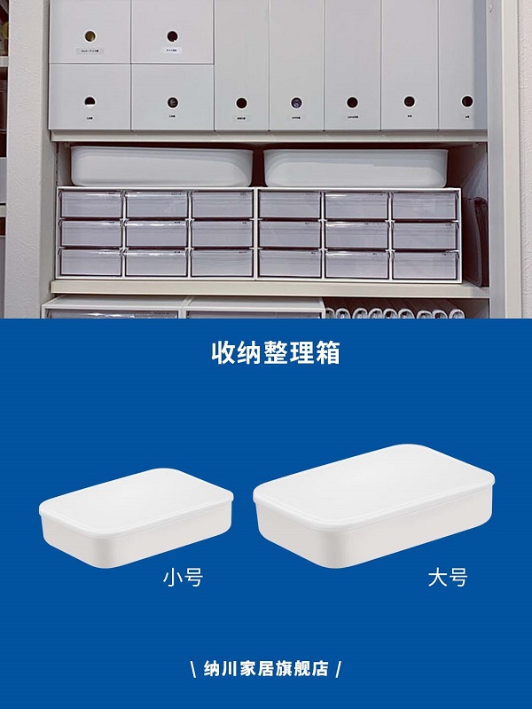 用帶蓋的收納箱對形狀不規(guī)則的學習用品、小工具等進行收納,蓋子既能防塵,疊放起來也更穩(wěn)固平整,鏤空拉手便于取出。