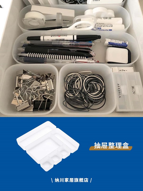 抽屜內(nèi)的分區(qū)是提升抽屜容量的關鍵,選擇適合物品的整理盒,分格收納小物件,物品一目了然,隨手取放方便快捷。