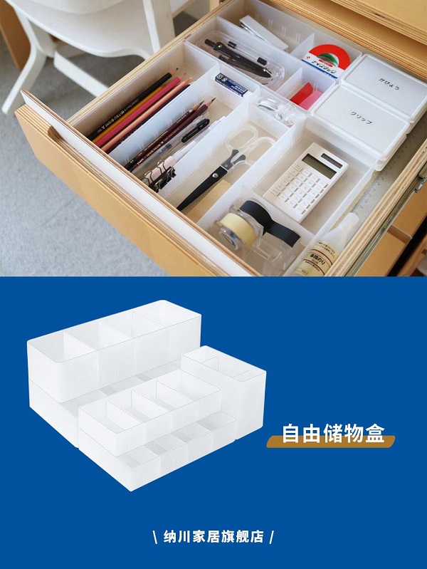 可疊加的自由儲物盒,可以作為抽屜分格使用,也能疊放放在桌面,內(nèi)置的隔板可以調(diào)節(jié),滿足更多收納需求。