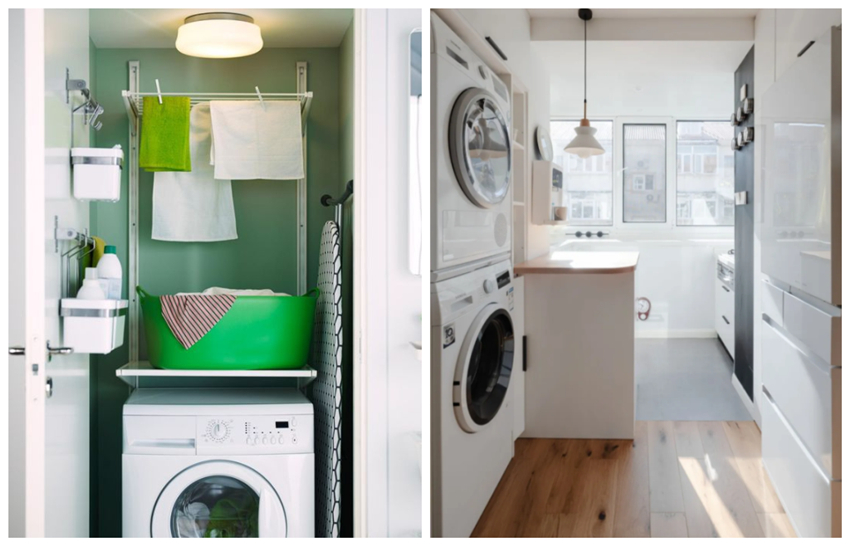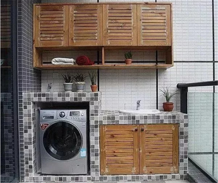 陽臺小并不意味著無法收納,拿出1㎡做柜體,最好做成上下兩層結(jié)構(gòu)的樣式,上層放清潔用品,下層放將洗衣機(jī)和烘干機(jī),達(dá)到“一柜多用”的效果。