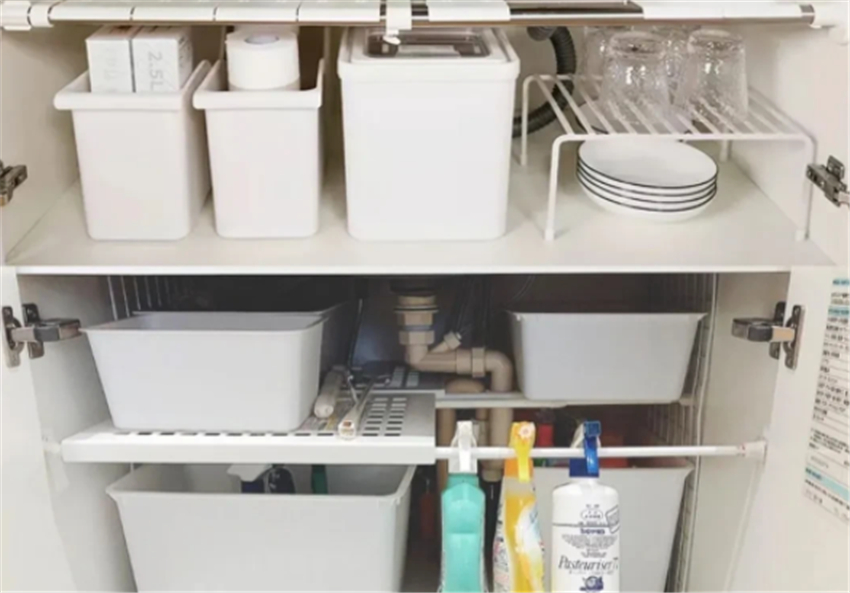 水槽下方空間用伸縮桿架空出物品放置位,各種廚具和清潔用具統(tǒng)統(tǒng)能藏起來,整潔干凈。