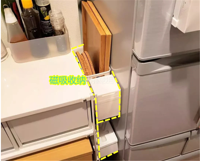 冰箱旁側(cè)的縫隙,可利用磁吸收納法,將塑料袋或者案板等小物件整齊擺起來。