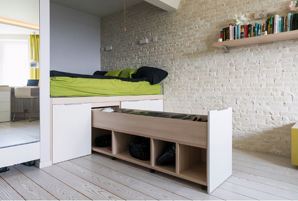 是的,小戶型的裝修最大的難題就是收納。解決的最大方法就是小角落的利用設(shè)計(jì),別再把床下這2、3㎡浪費(fèi)掉了,抬高做抽屜式收納,既能擁有一個(gè)小衣帽間,還能很大程度提升臥室的儲(chǔ)物能力。