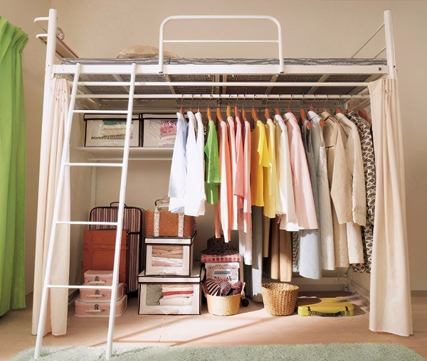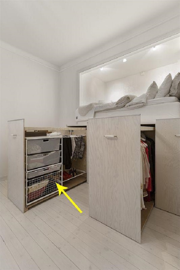床抬高后,床底嵌入這樣一個(gè)抽拉柜,便可以實(shí)現(xiàn)很好的區(qū)域儲(chǔ)物。設(shè)計(jì)到位的話,掛衣區(qū)、疊衣區(qū)也是可以全部擁有的。等到一個(gè)巧妙的設(shè)計(jì),就讓自己的小臥室,也能擁有一個(gè)小衣帽間。