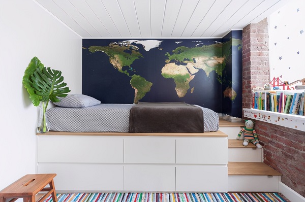 這是比較常見(jiàn)的一種設(shè)計(jì)方式,對(duì)于層高要求沒(méi)那么高。抽屜可以用于存放一些小物品或者雜物,做的時(shí)候建議采用無(wú)把手的設(shè)計(jì),可以更好的減少磕碰。