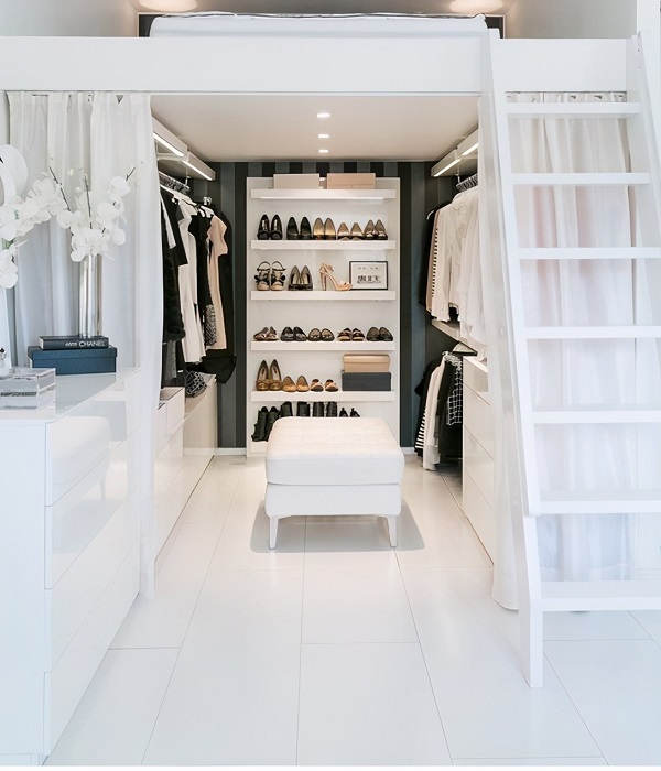 抬高后做成一個(gè)步入式的衣帽間。而選擇移門(mén)最大的好處是可以不占據(jù)空間,對(duì)于小空間來(lái)說(shuō),操作更加的便捷。