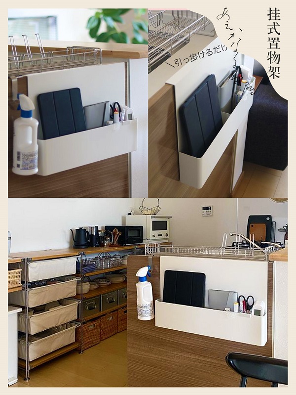 扁平形的置物架,可以掛在櫥柜門(mén)或餐邊柜,擴(kuò)展收納功能,放一些常用的小工具、食譜、平板電腦等,不占臺(tái)面空間,隨手就能拿到。