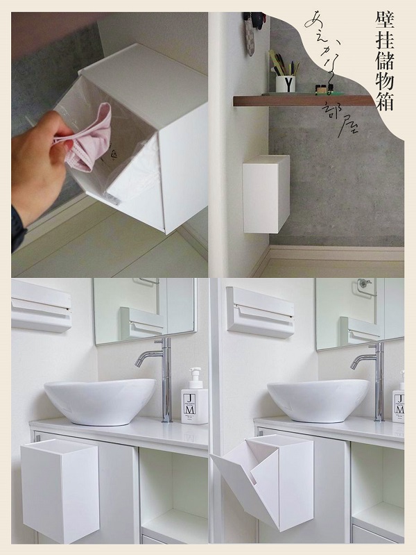 這個(gè)用魔術(shù)膠帶粘貼的箱子,可以把它貼在馬桶或洗手臺(tái)旁?xún)?chǔ)物,或用作垃圾桶。這樣浴室地板更容易清潔。如果不想把廢紙和一次性口罩等不必要的垃圾帶進(jìn)家里,把它貼在玄關(guān)鞋柜的側(cè)面,用作入口處的垃圾桶也不錯(cuò)。