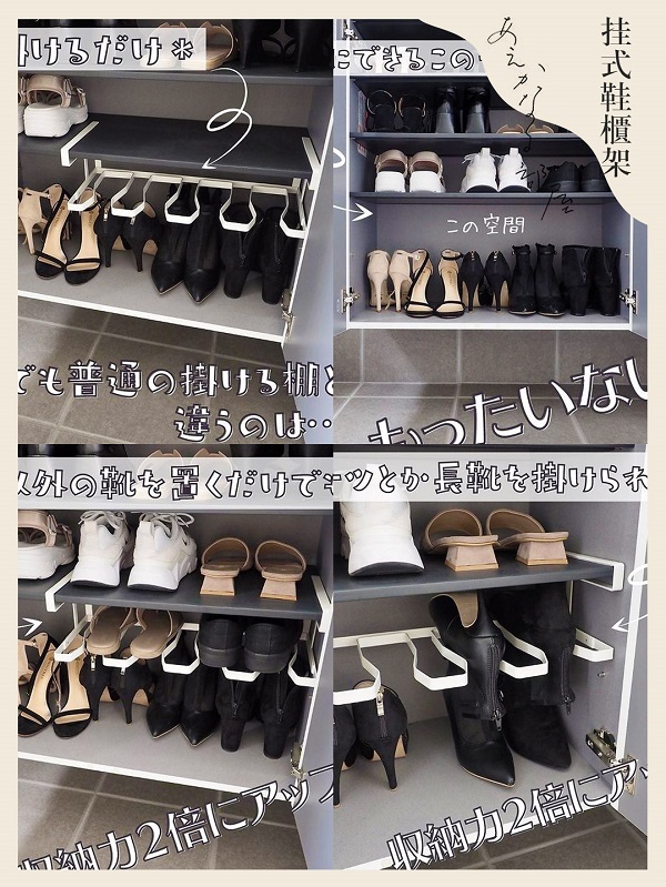 很多鞋子其實(shí)只占了鞋柜隔層不到一半的高度,如果你有很多鞋子,一定要試試這個(gè)鞋架,直接掛在鞋柜隔板就能用,短靴類(lèi)可以倒置垂直存放,普通的運(yùn)動(dòng)鞋和涼鞋平放在上面,鞋柜存儲(chǔ)量增加了一倍。