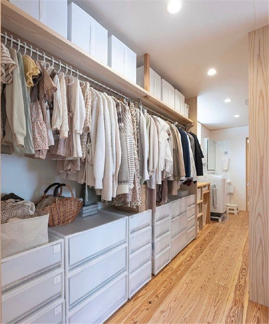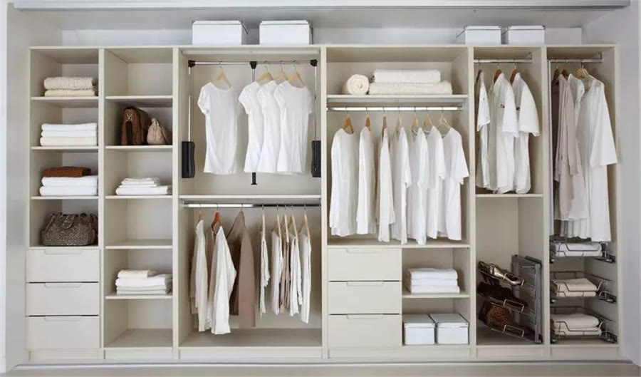 其次,衣柜內(nèi)盡量多地增加掛置區(qū)域,減少疊放區(qū)域,因?yàn)檫@樣收納不僅清晰明了,拿放也方便很多,給收納減輕負(fù)擔(dān),也有助于養(yǎng)成隨拿隨放的收納習(xí)慣。