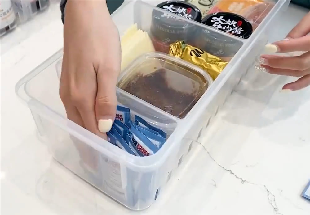 將它們整整齊齊地放到冰箱內(nèi)的空間中,同樣透明的盒子也可以讓內(nèi)部收納的物品完整呈現(xiàn)在眼前,免去翻找的麻煩。