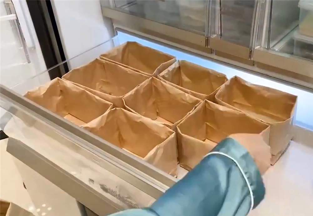 中間的保鮮層,這位姑娘換了一種方式,用一個(gè)個(gè)的方形紙袋填滿空間。