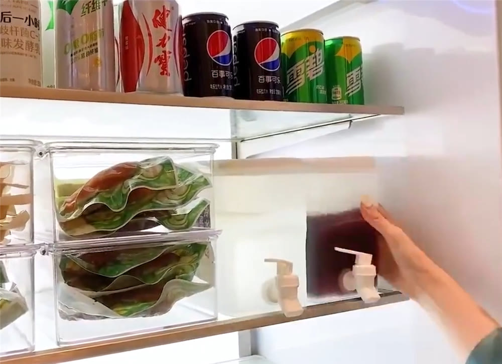 放到冰箱的中間高度位置,想要喝的時(shí)候可以打開水龍頭,隨時(shí)能喝到冰鎮(zhèn)的飲品,對(duì)于沒有冰吧的冰箱來(lái)說(shuō),這樣做方便得很!