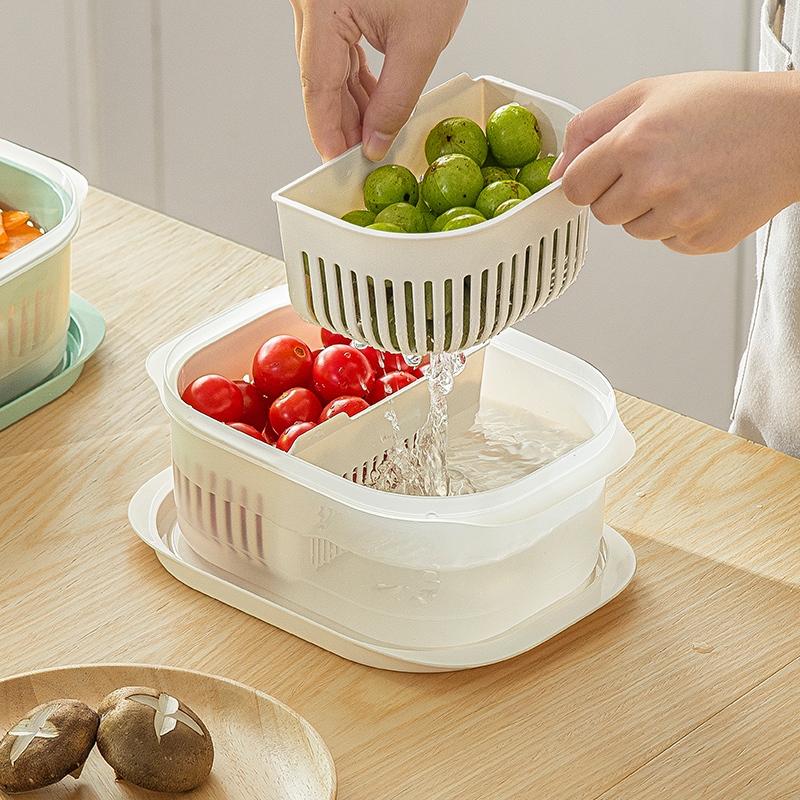 果蔬清潔后再放入冰箱,可以減少冰箱內(nèi)的細(xì)菌滋生,納川保鮮瀝水盒,瀝水收納一盒兩用,內(nèi)盒控干水分,外盒接水,臺(tái)面整潔干爽。瀝水內(nèi)盒可拆卸,分格存放不同食材。TPE軟蓋密封鎖鮮,衛(wèi)生不串味??芍糜诒淅洳?,盒身透明可視窗,物品一目了然。蓋子三色可選,便于區(qū)分儲(chǔ)存物品,貼心便捷。