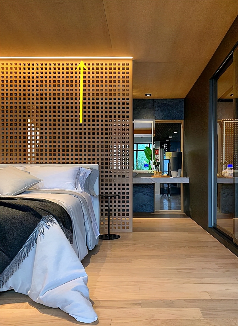 接著來(lái)說(shuō)說(shuō)這個(gè)隔斷的設(shè)計(jì)。材質(zhì)建議還是選擇木質(zhì)材料,更加的舒適溫潤(rùn)。做的時(shí)候可以像上圖這樣,搭配上燈帶,讓整體的裝飾效果更佳。