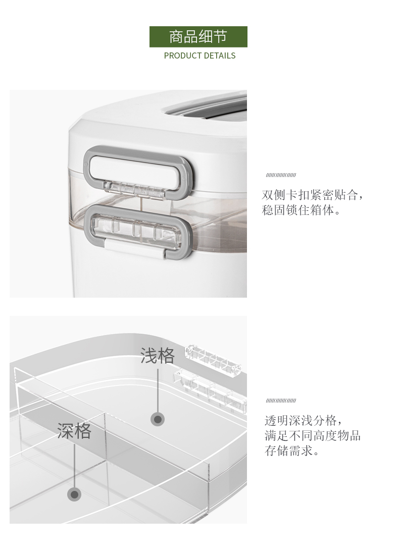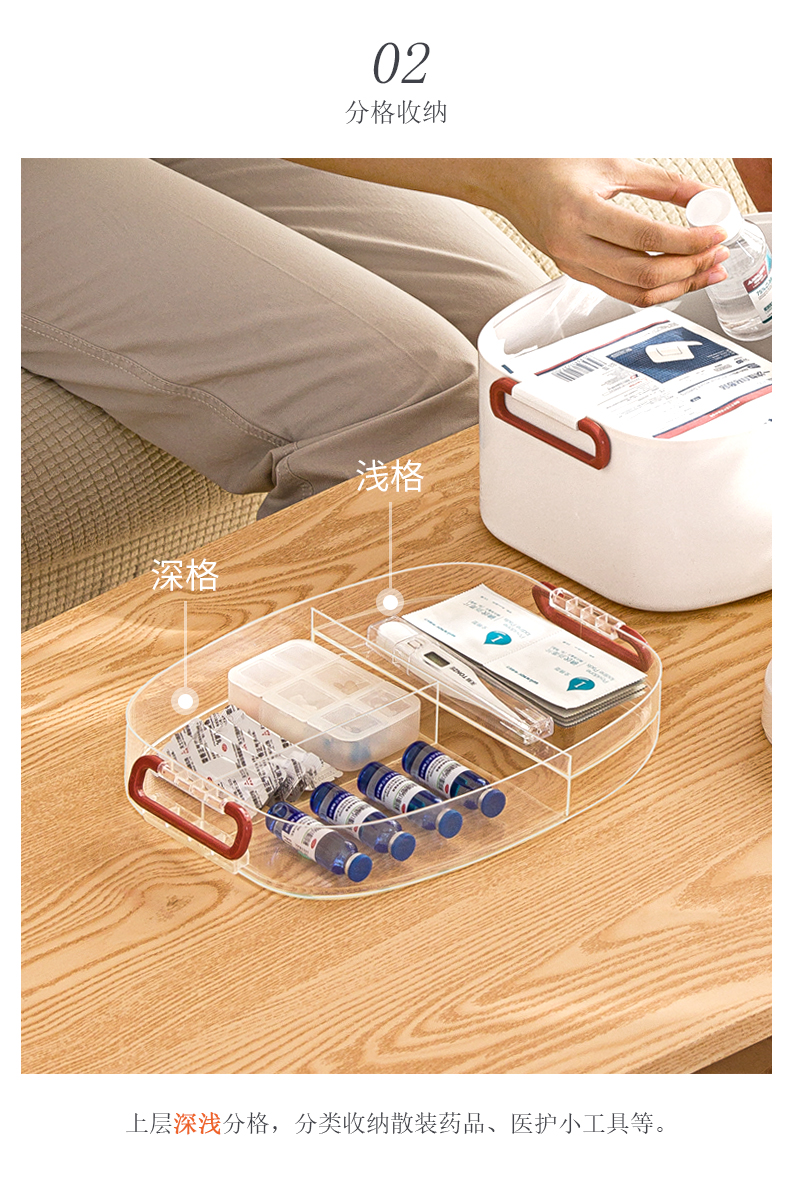 1、分格收納:上層不同深度分格,分類收納散裝藥品