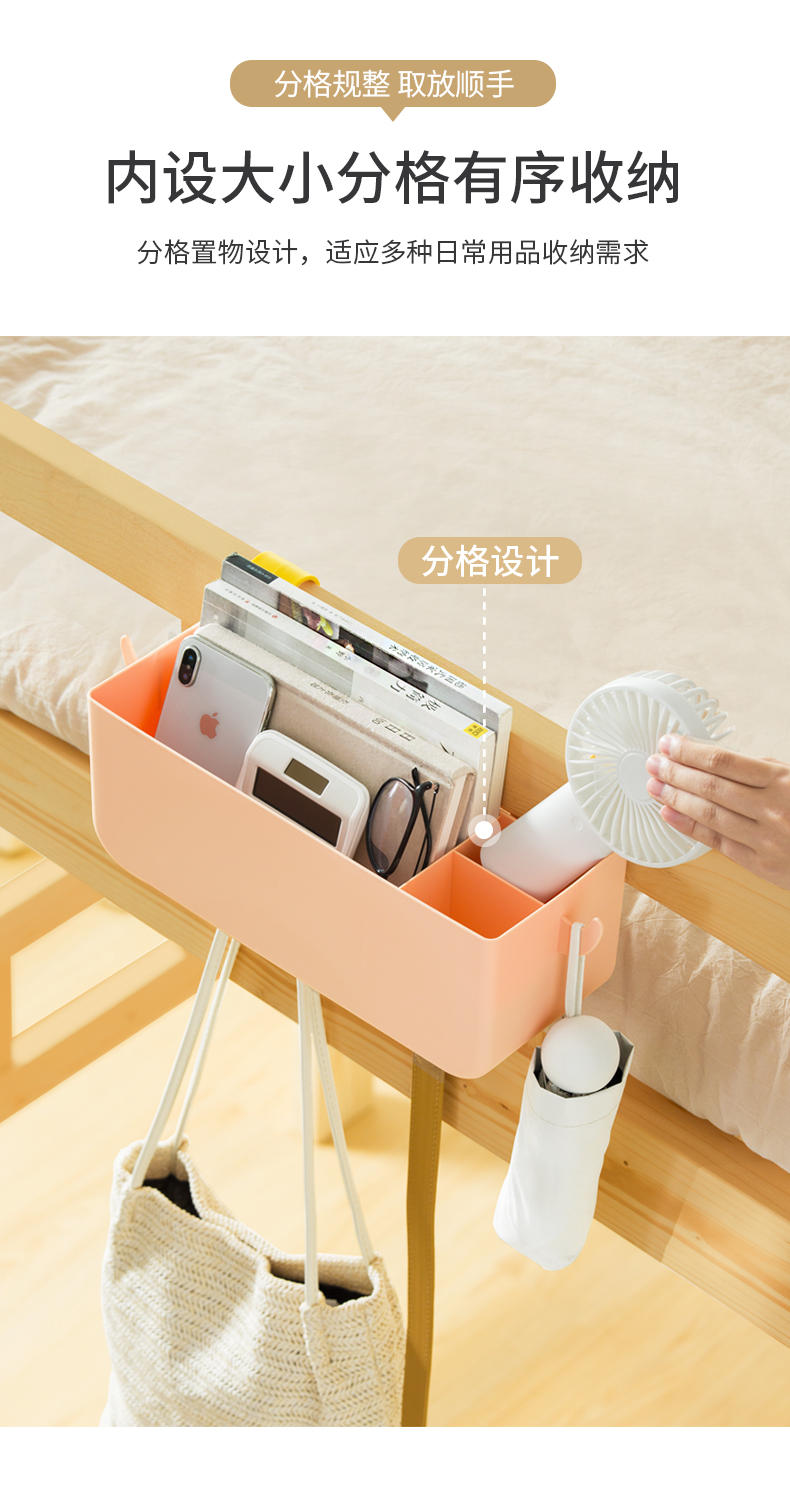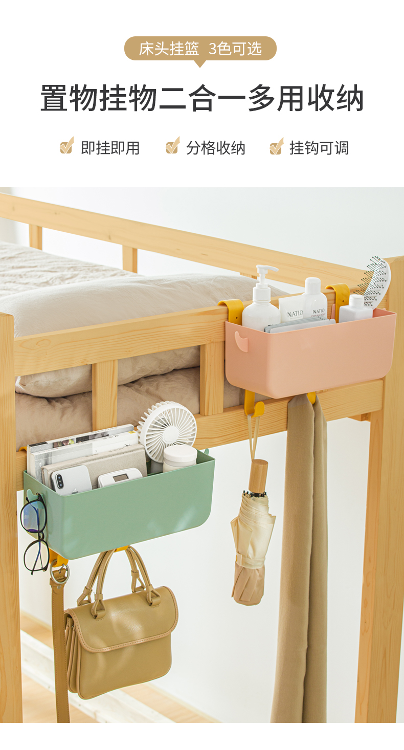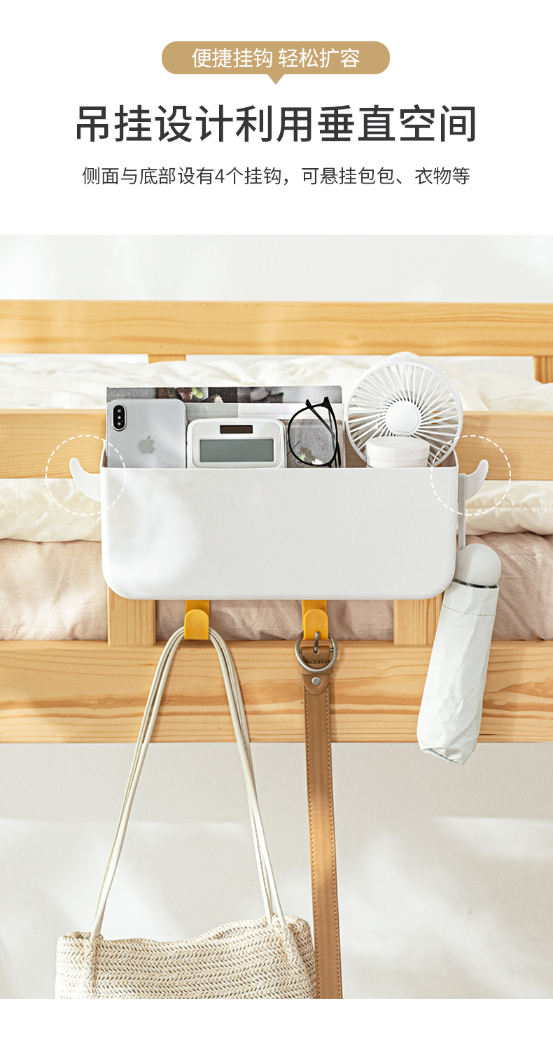 1.床邊收納:吊掛于床頭或者床尾的護(hù)欄,拓展空間