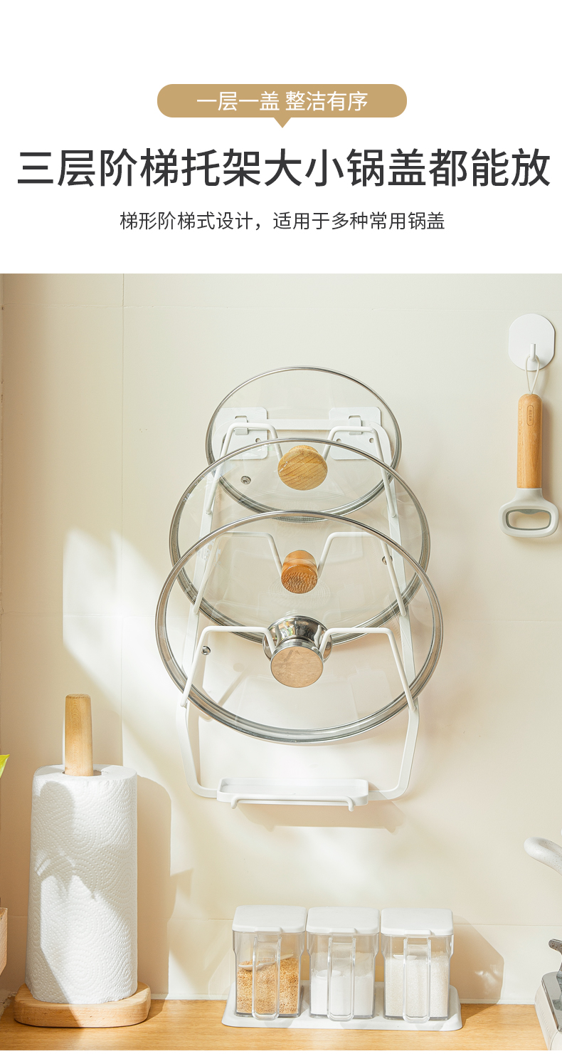 2、一層一蓋:三層階梯托架,大小鍋蓋都能放